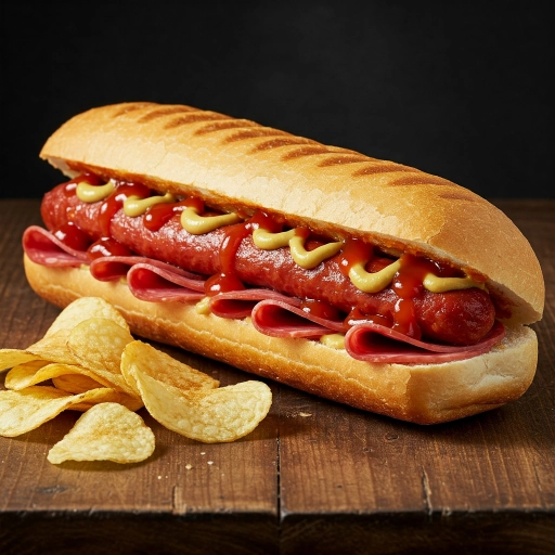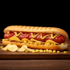 Pão, molho, salsicha, ovo, queijo, batata palha e salada